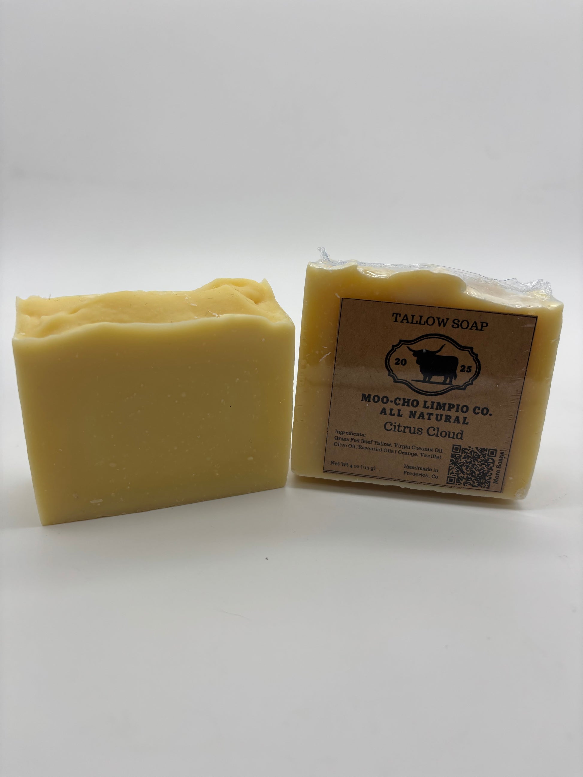 Brighten your day with the uplifting scent of Citrus Cloud Tallow Soap, a handmade bar from Moo-Cho Limpio Co. crafted with grass-fed beef tallow, virgin coconut oil, and olive oil for a creamy, luxurious lather that deeply nourishes and hydrates your skin.