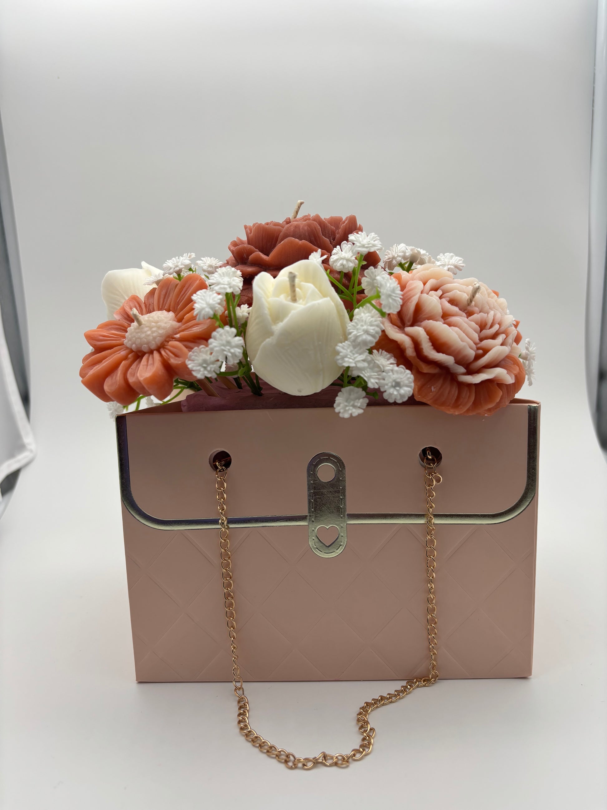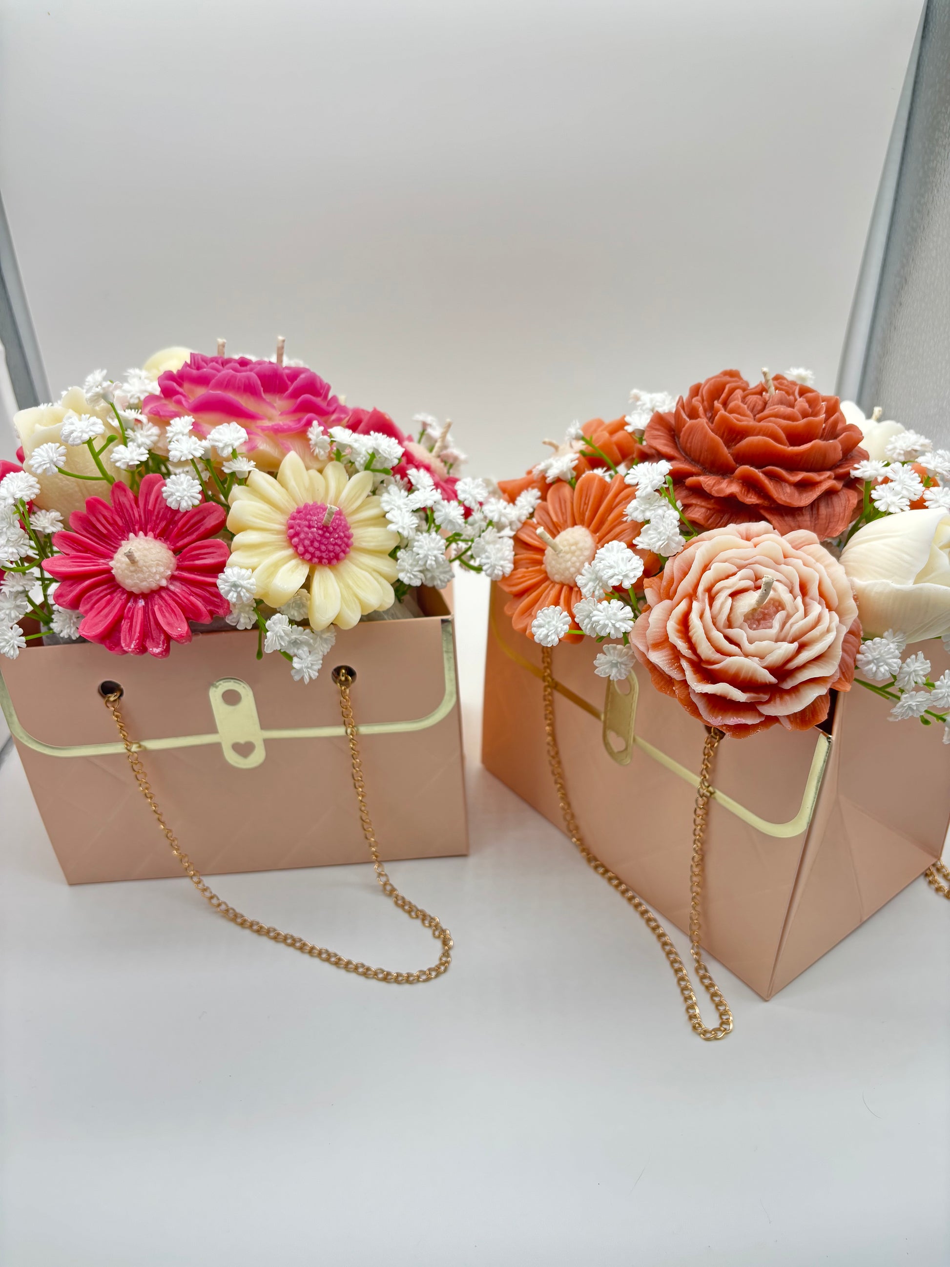 Whether you’re celebrating a birthday, anniversary, Mother’s Day, or simply want to brighten your home, these purse-shaped candle flower arrangements are a unique and unforgettable gift.
